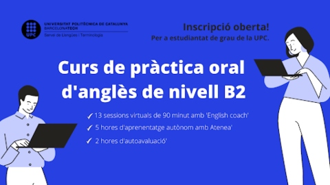 El Servei de Llengües i Terminologies de la UPC organitza un curs de pràctica oral d'anglès de nivell B2, un curs virtual per ajudar-te a millorar l'expressió oral en anglès ("speaking") amb un English coach.